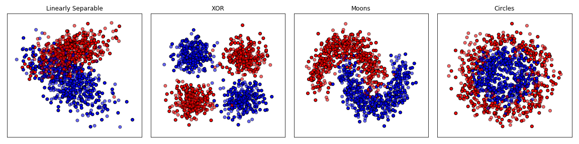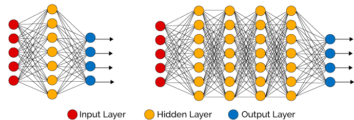For example, here are the decision boundaries for three MLPs with 1, 2 and 4 hidden layers of 3 neurons each, and a single output feature for binary classification: